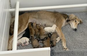 Tied to a railing, starving, and heavily pregnant – sighthound, Valerie, was barely surviving. But everything changed when she was rescued and brought to safety at Bath Cats and Dogs Home, nine days later she gave birth to 11 puppies.