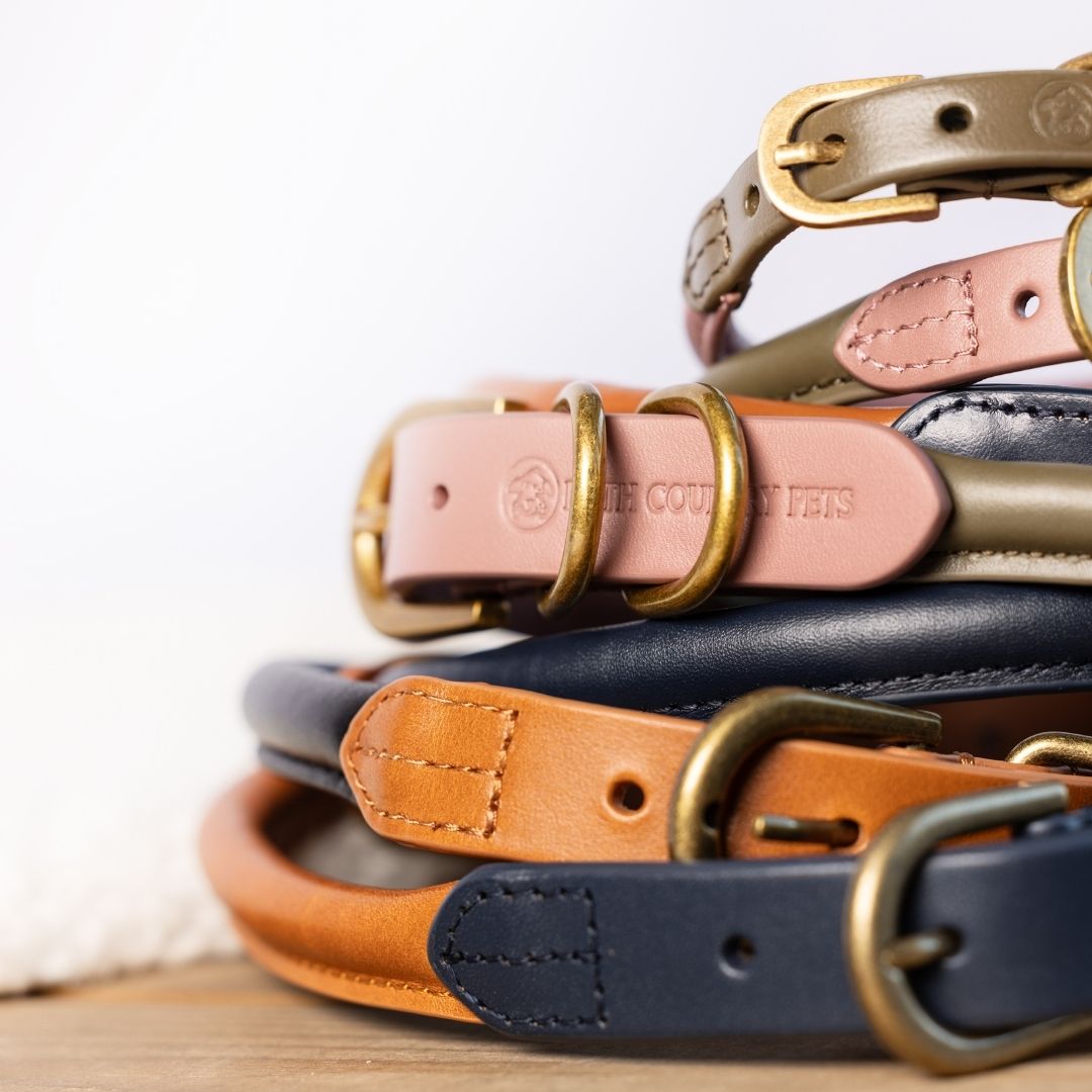 Super soft rolled leather with sturdy brass coloured fittings make these elegant collars really attractive. This style is mainly navy with a smart tan leather section around the buckle and D rings. The small and the extra small sizes have slightly smaller and lighter brassware and a slimmer rolled section, to suit daintier dogs.