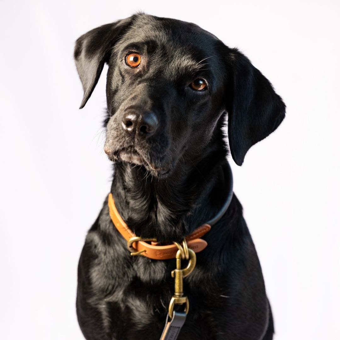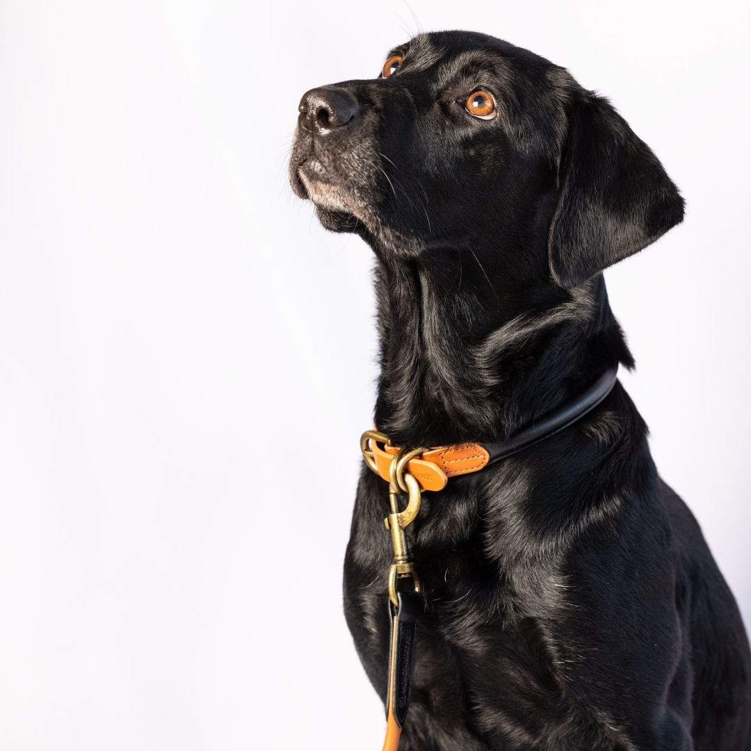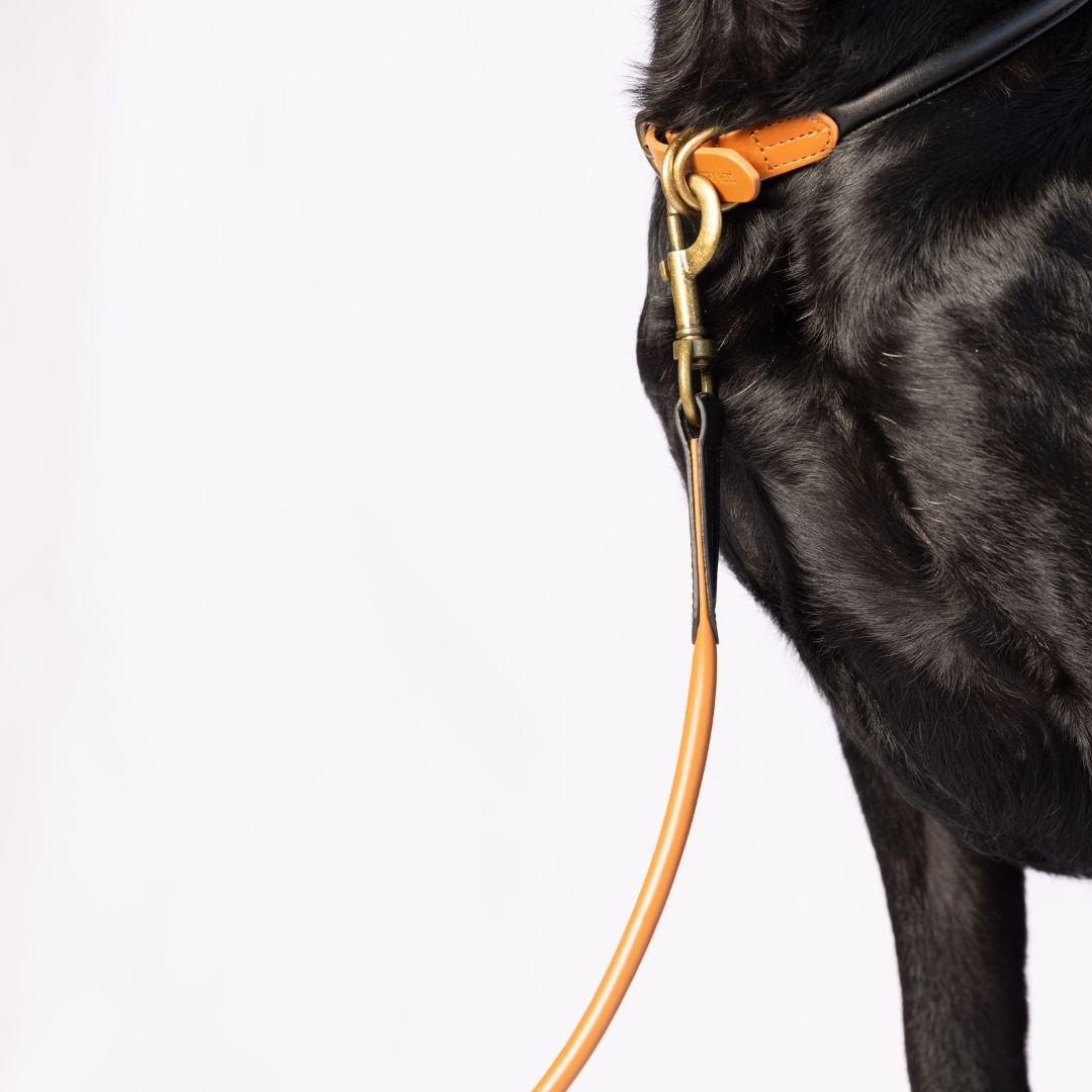 Super soft rolled leather with brass fittings make these elegant 1.2 metre leads comfortable for both you and your dog. The leads feature a padded handle with a brass ring that allows the lead to be halved in length for when you want to have closer control. The brass swivel trigger clip stops the lead from becoming twisted. This option is from our classic colour pallet, with options which feature mainly Black with Tan accents or the same colour ways but in reverse, mainly Tan with Black.